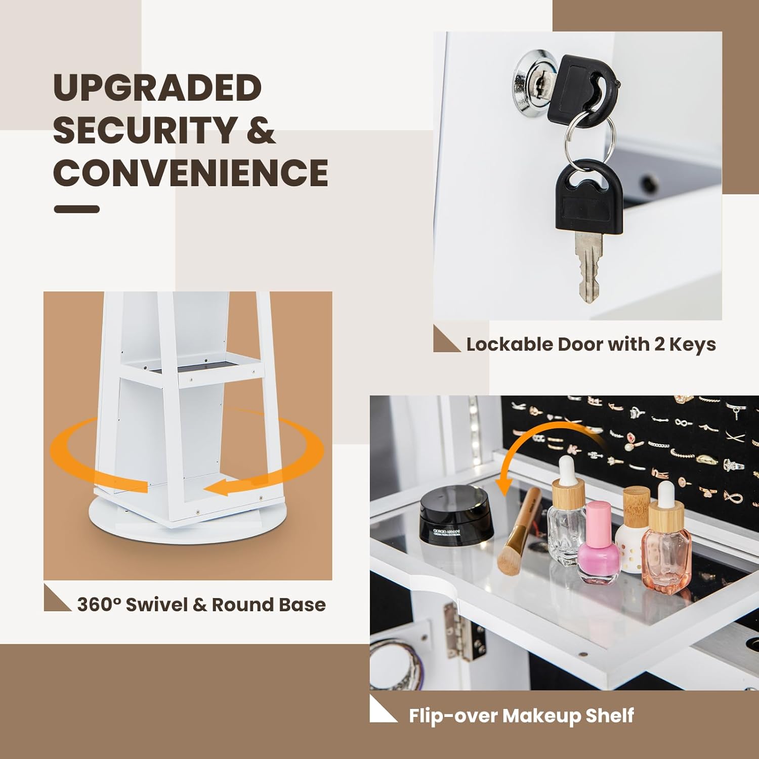 Base Stabile con Rotazione a 360° – L’armadio portagioie con base girevole a 360° non solo facilita l’accesso ai tuoi oggetti essenziali, ma ti permette anche di trovare la posizione ideale per guardarti allo specchio. Questo armadio per gioielli è progettato con una base più ampia e, grazie alle cinghie di fissaggio, offre una doppia protezione contro il ribaltamento.