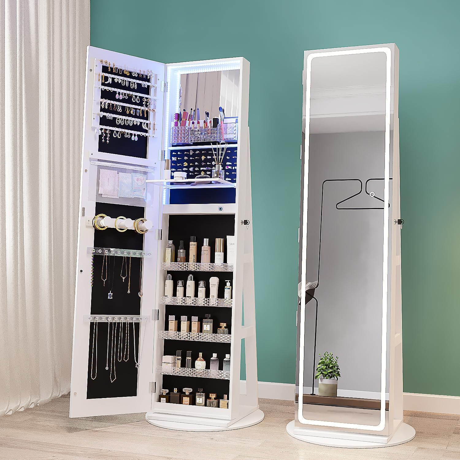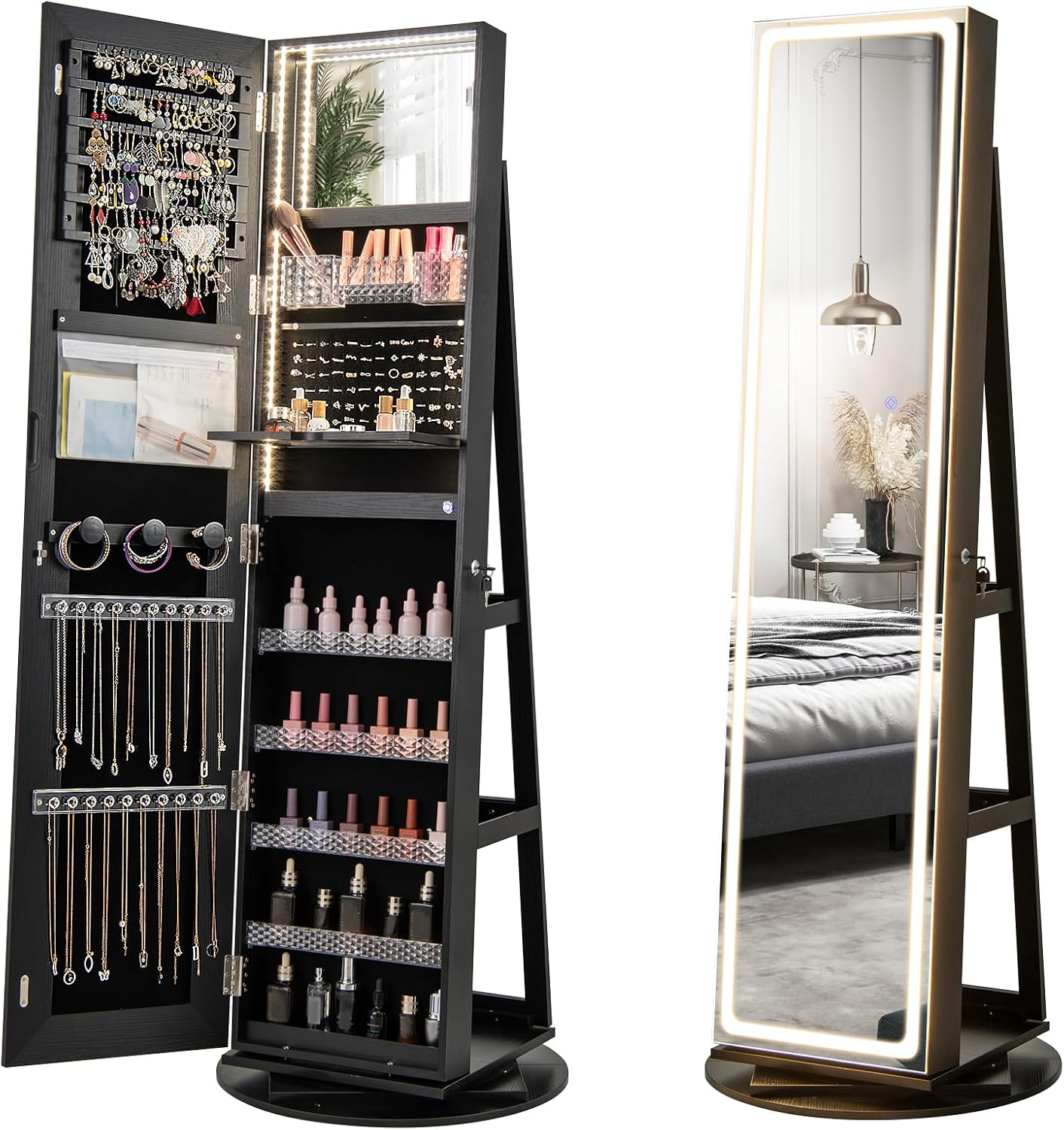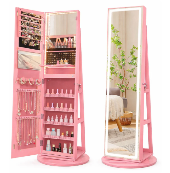 Specchio a Figura Intera con Luci LED Regolabili – Questo armadio portagioie girevole è dotato di uno specchio a figura intera con luci LED dimmerabili, con 3 tonalità di luce e funzione di memoria intelligente. Tramite il pulsante touch puoi trovare l’illuminazione perfetta per controllare il tuo aspetto.